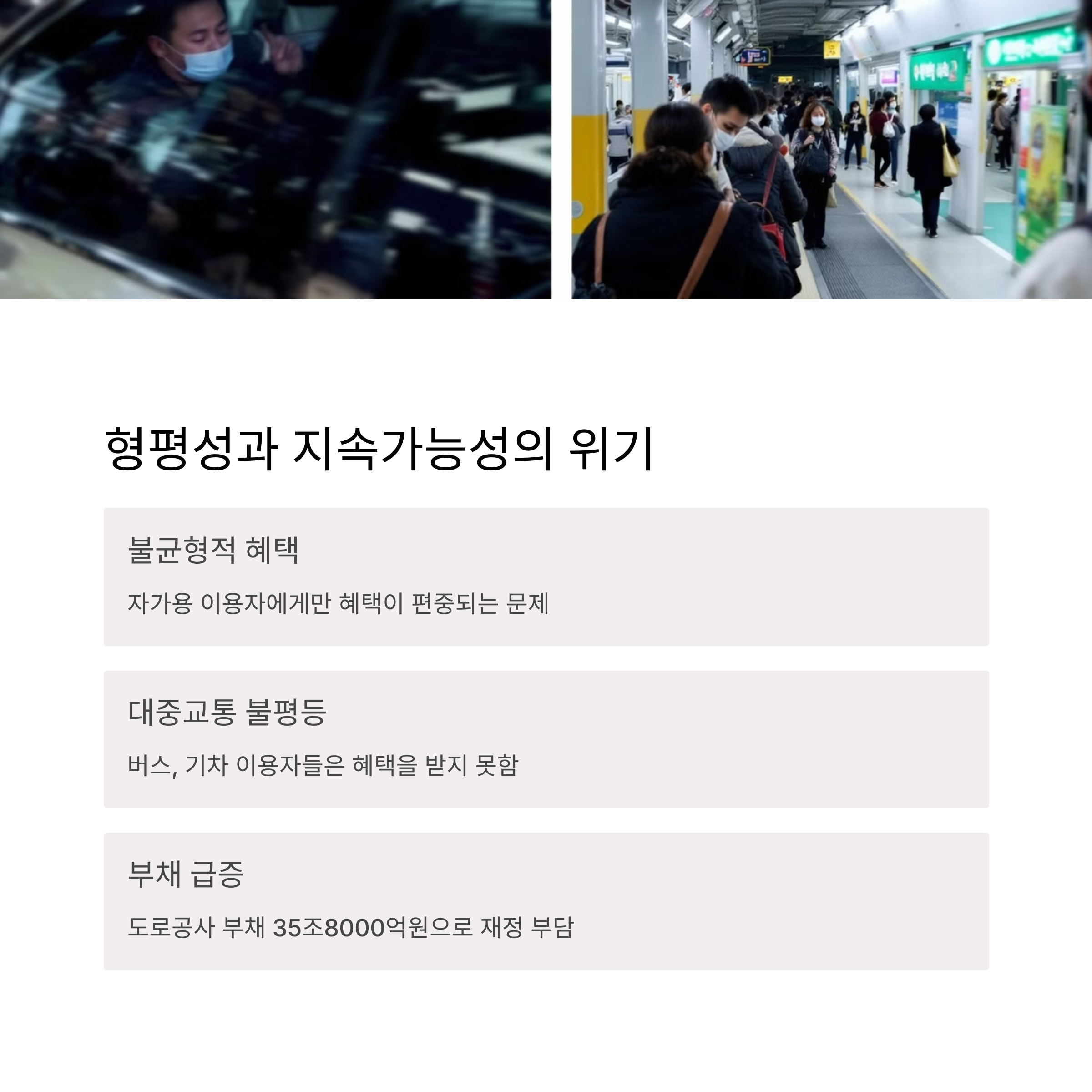 | 공공재로서의 교통 인프라 | 형평성 논란과 정책 딜레마 | 대중교통 이용 감소와 에너지 낭비 우려 |