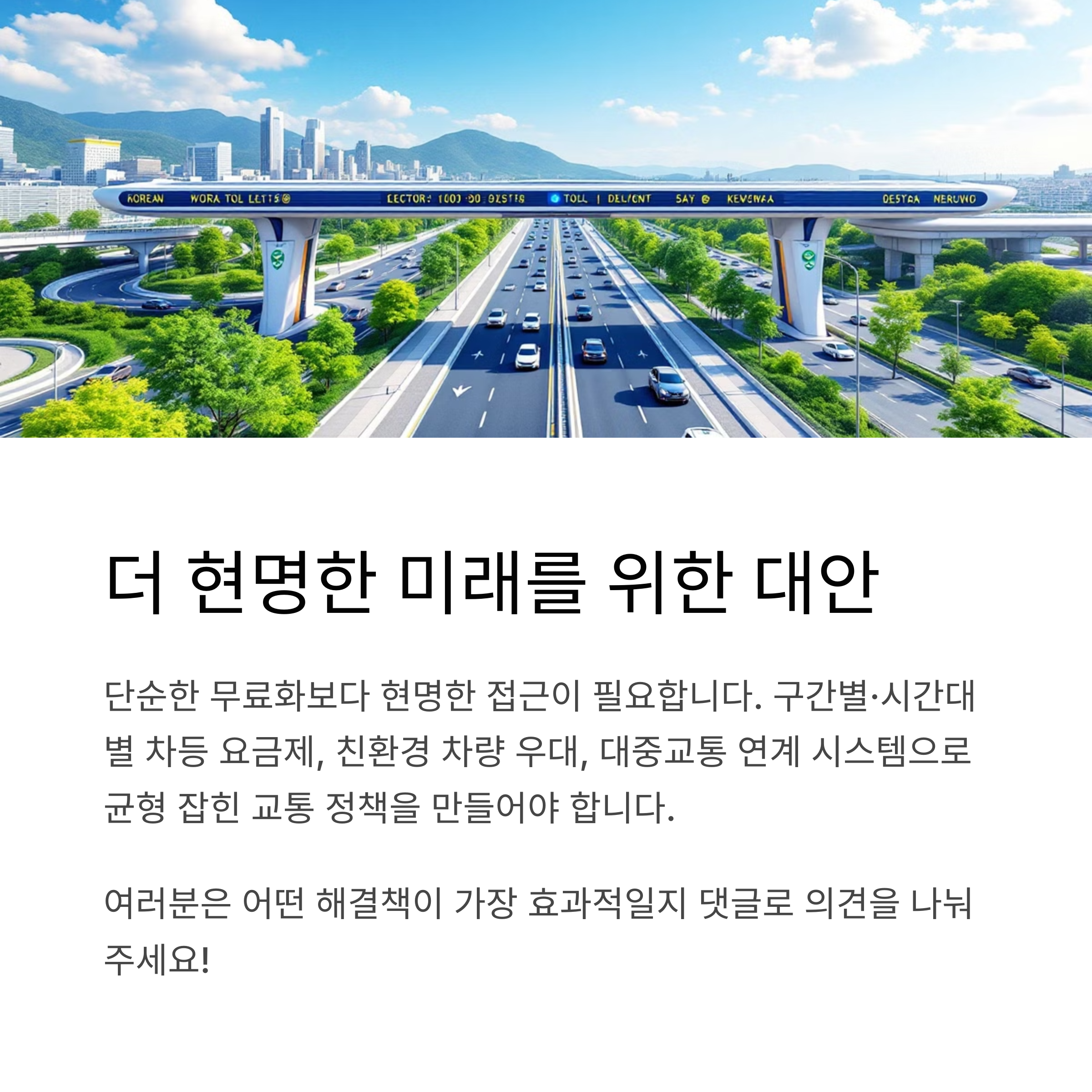 고속도로 무료 정책, 여러분은 어떻게 생각하시나요? 찬성하시나요, 아니면 반대하시나요? 그 이유와 함께 여러분의 소중한 의견을 댓글로 남겨주세요!