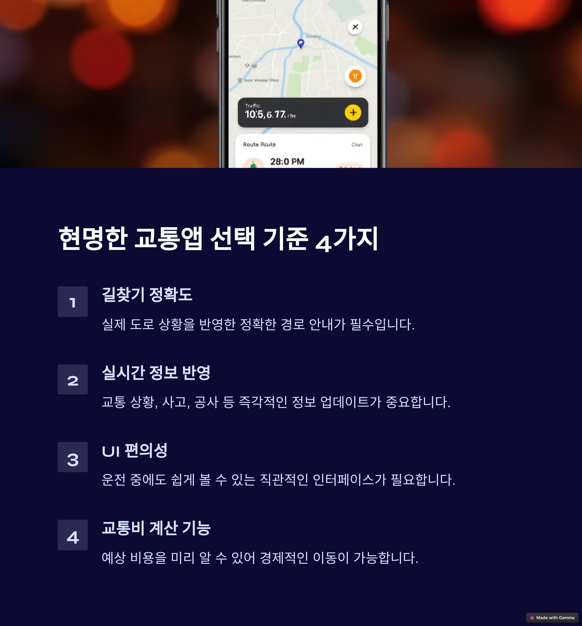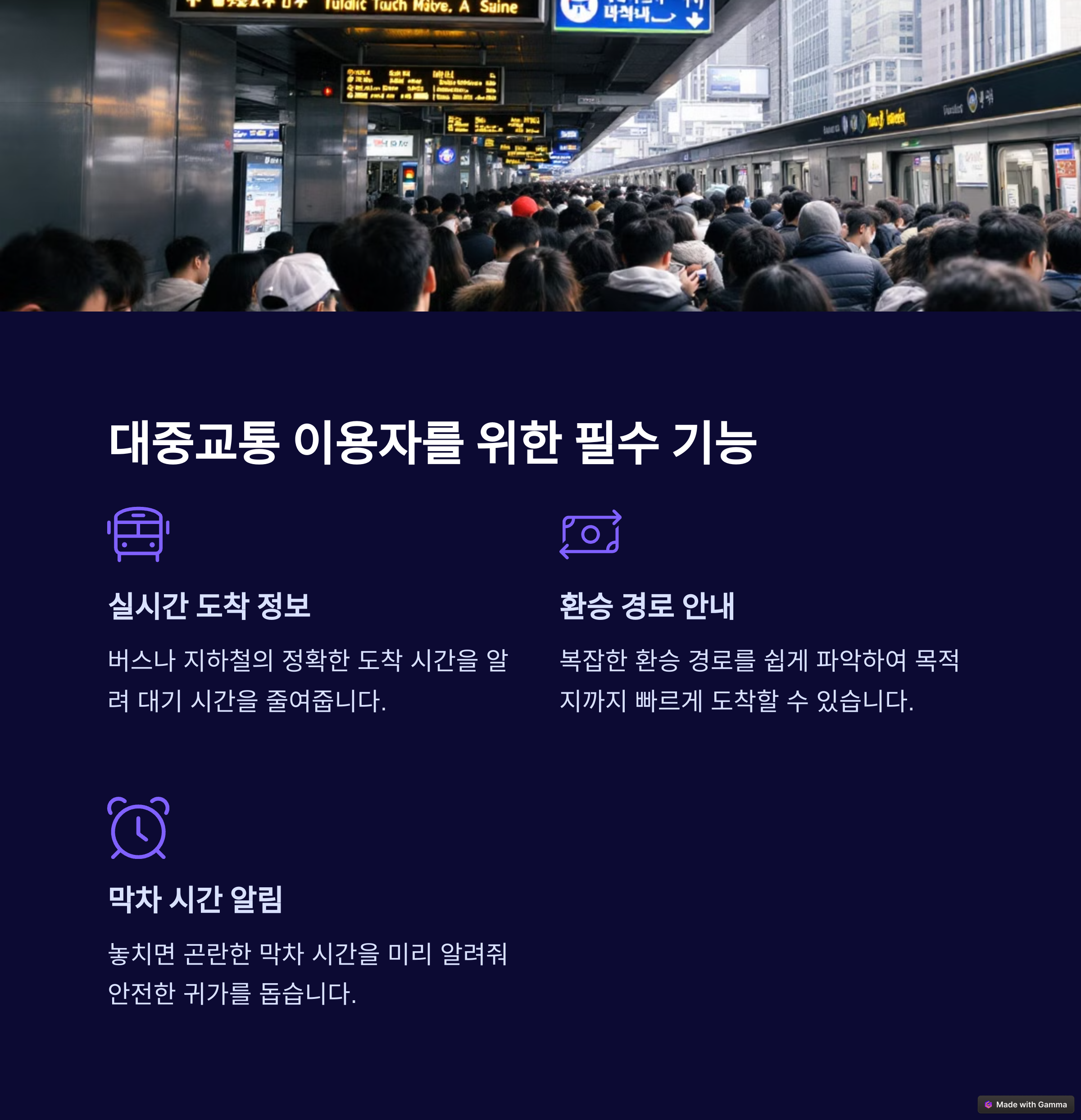 | 길찾기 정확도 | 실시간 정보 | 교통비 계산 |