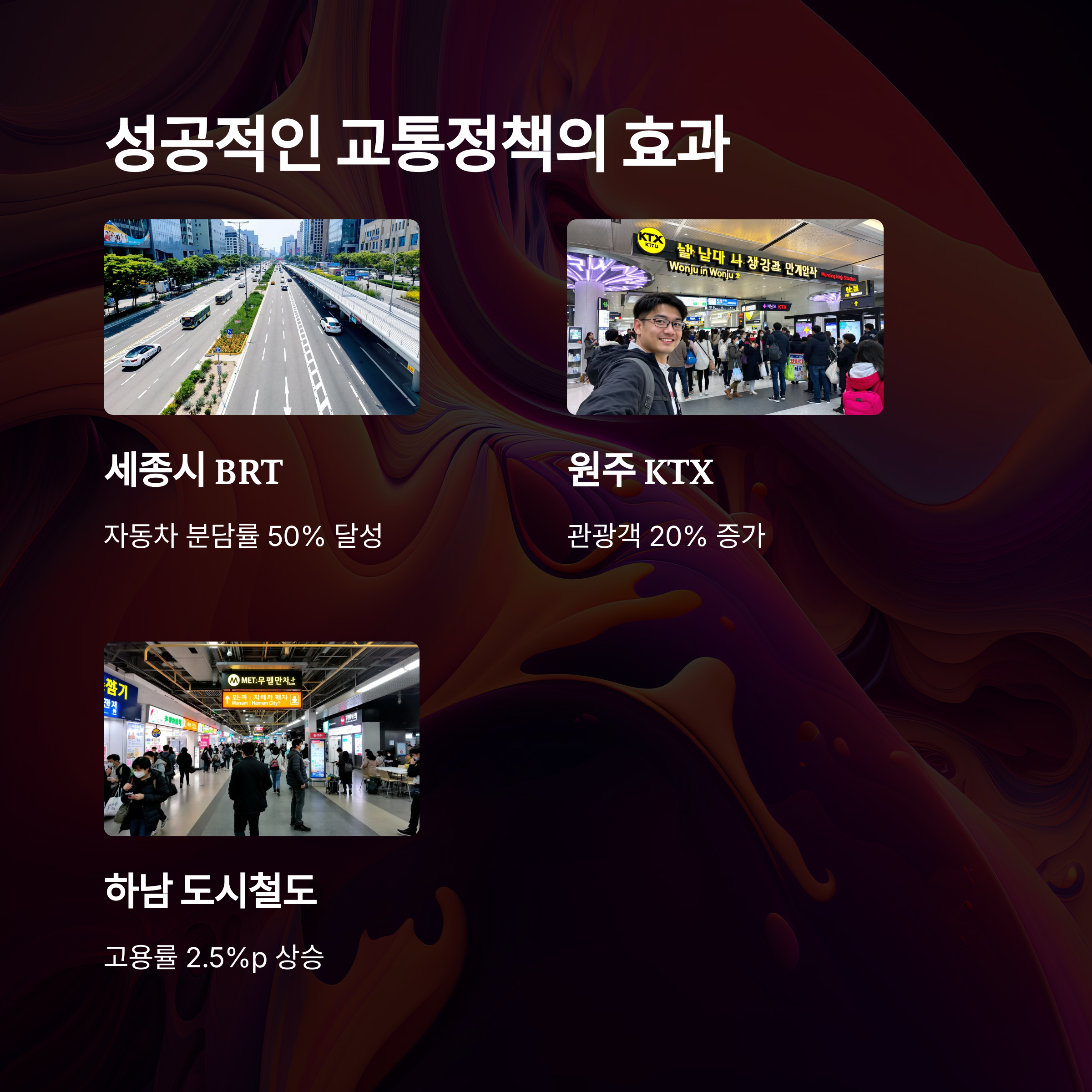 | 지역 경쟁력 | 교통환경에 따라 투자유치 및 고용 창출도 달라짐 |