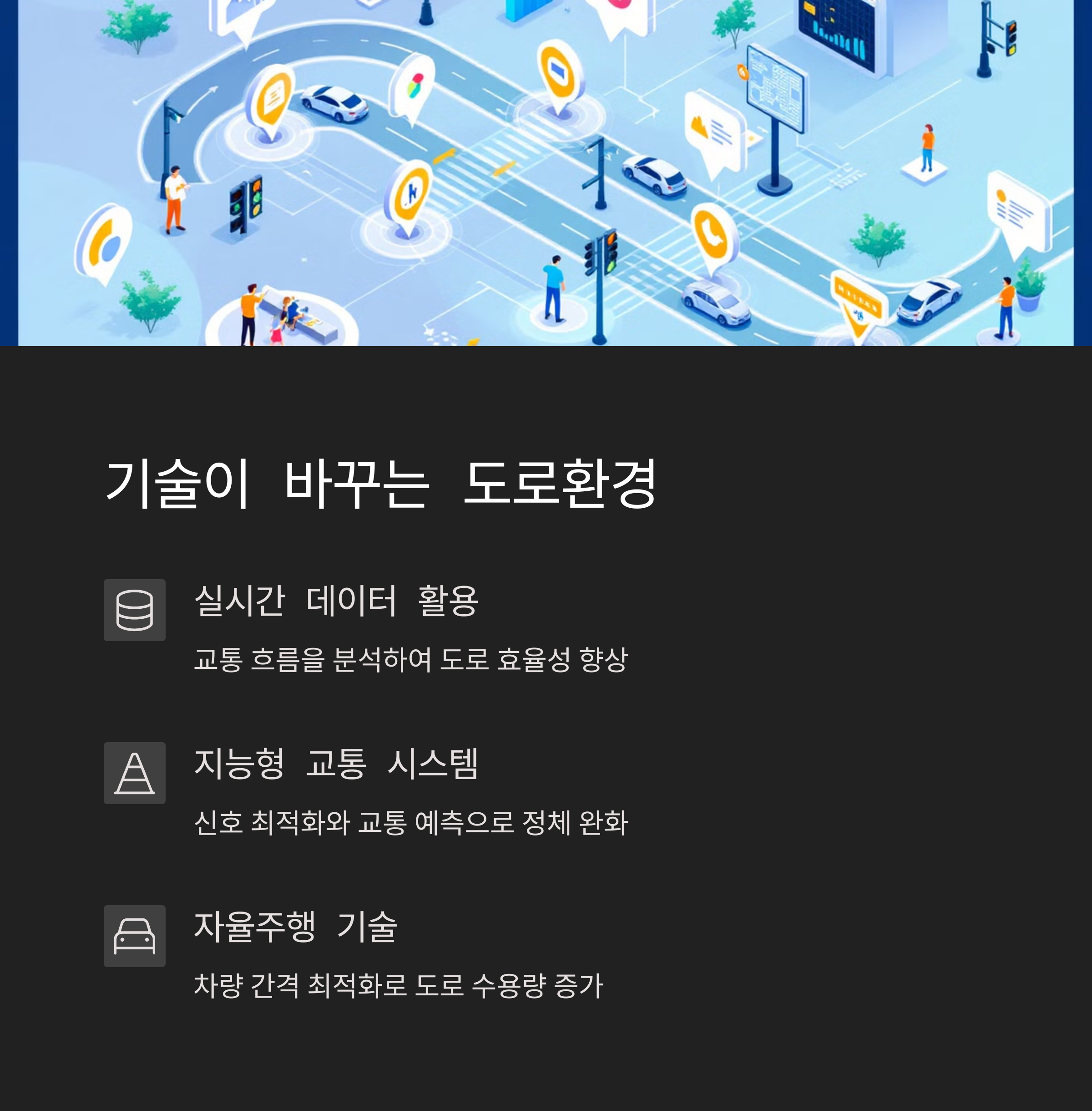 | 스마트 교통 기술 | AI, 빅데이터, 자율주행 등을 활용해 교통 흐름을 개선합니다. |