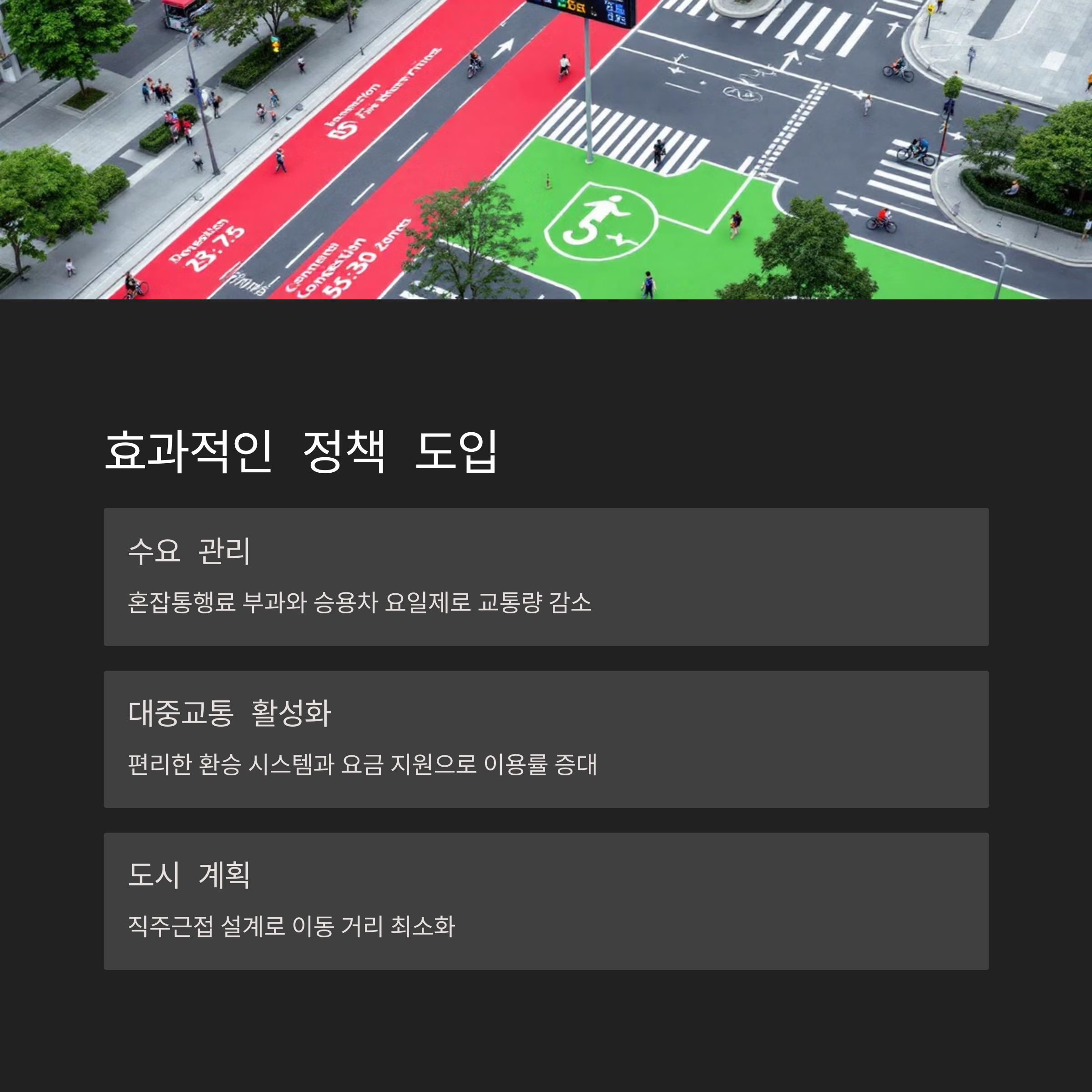 | 교통 정책 | 혼잡 통행료, 차량 제한 등 제도적 방법으로 교통을 조절합니다. |