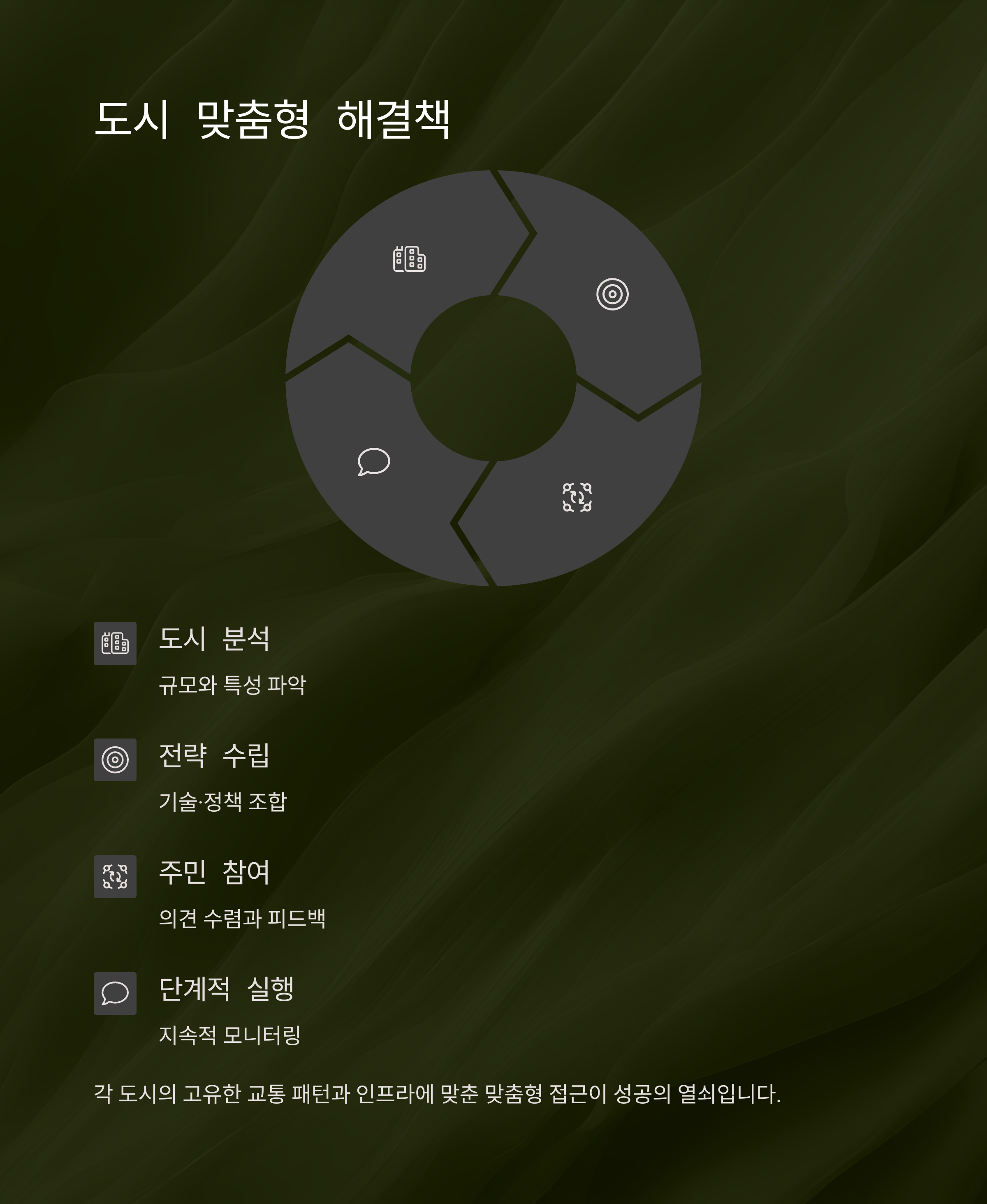 | 자율주행 기반 차량 흐름 안정화 | 법제화와 제도 강화 중심의 조정 | 도시 특성 맞춤형 선택 적용 |