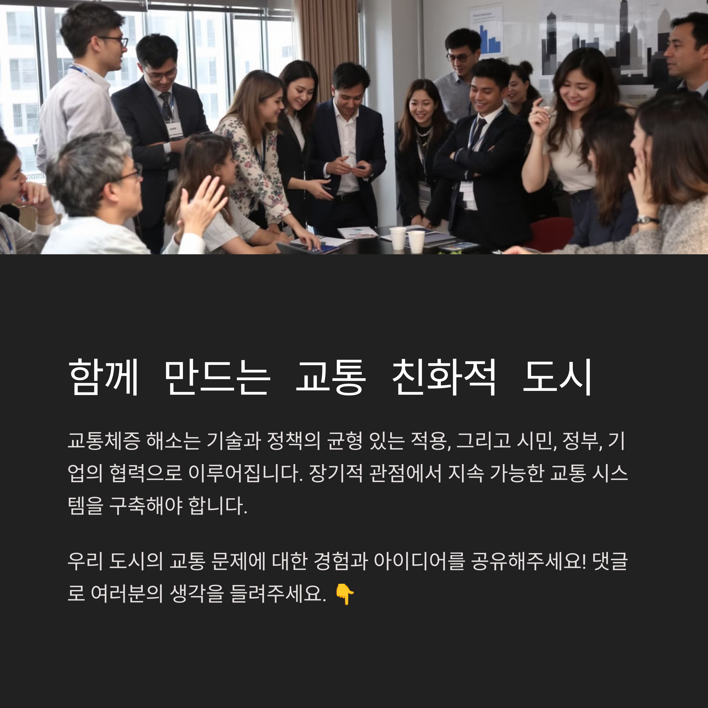 여러분은 교통체증 해소를 위해 기술과 정책 중 어떤 방식이 더 효과적이라고 생각하시나요? 경험과 생각을 댓글로 나눠주세요!