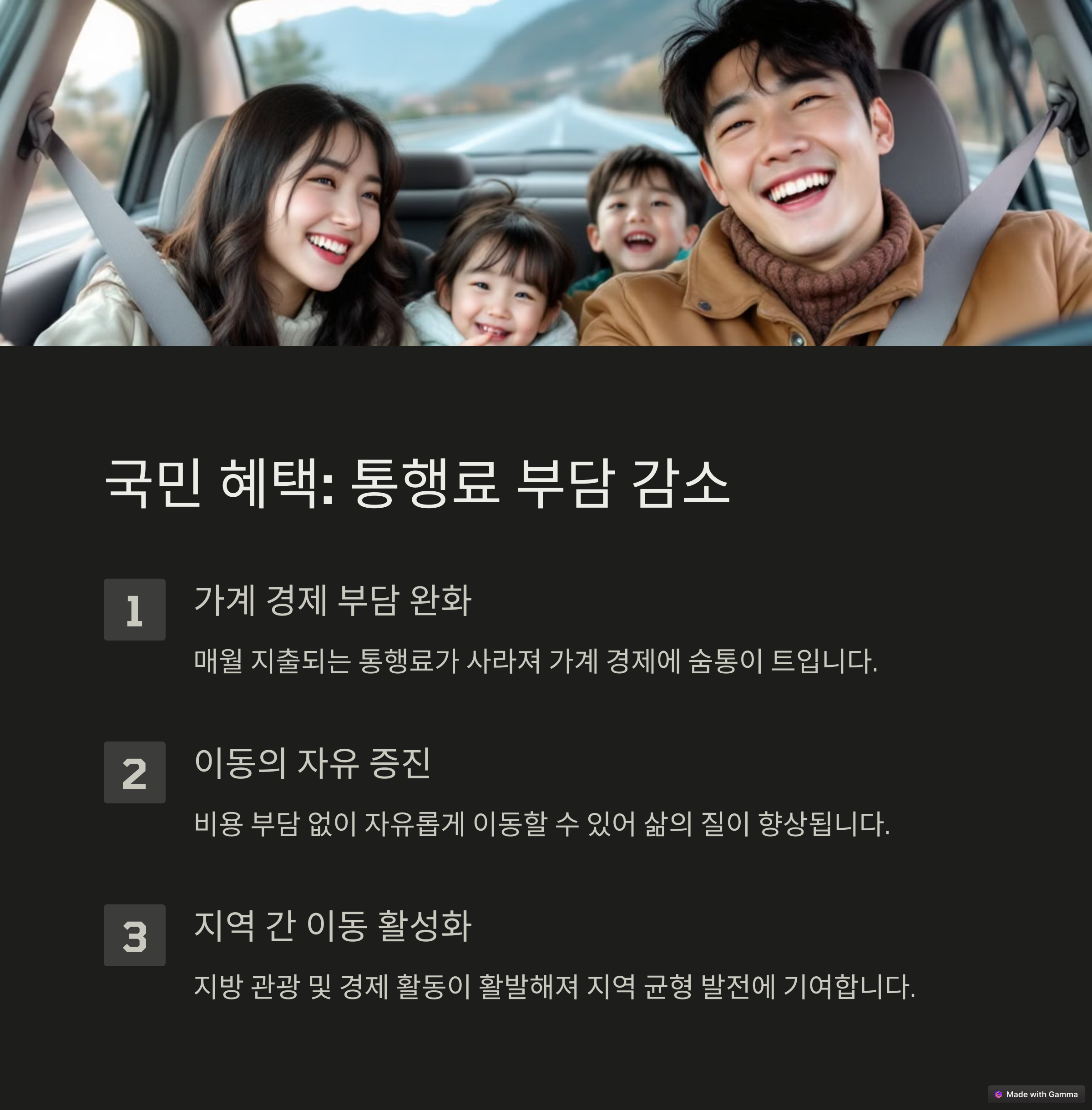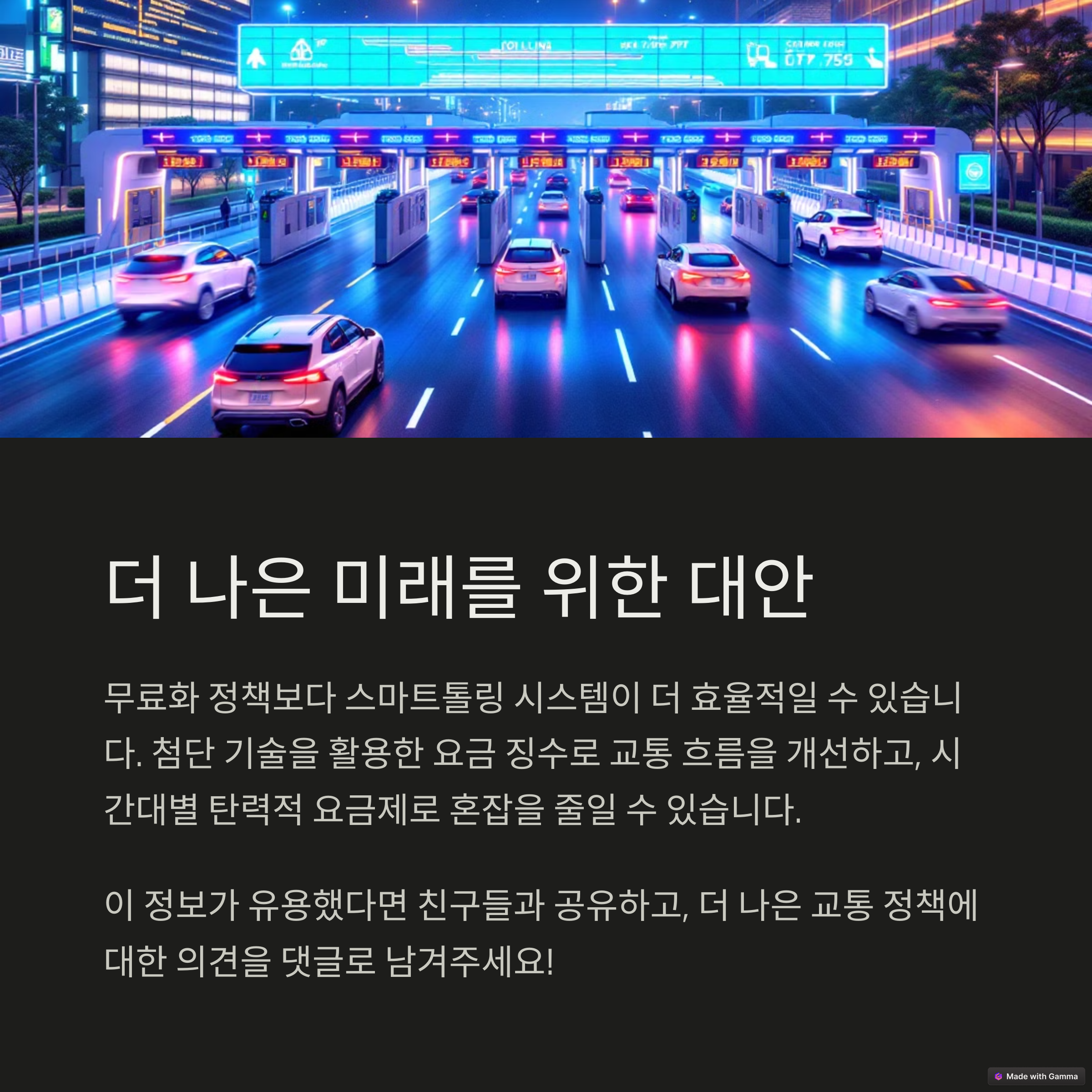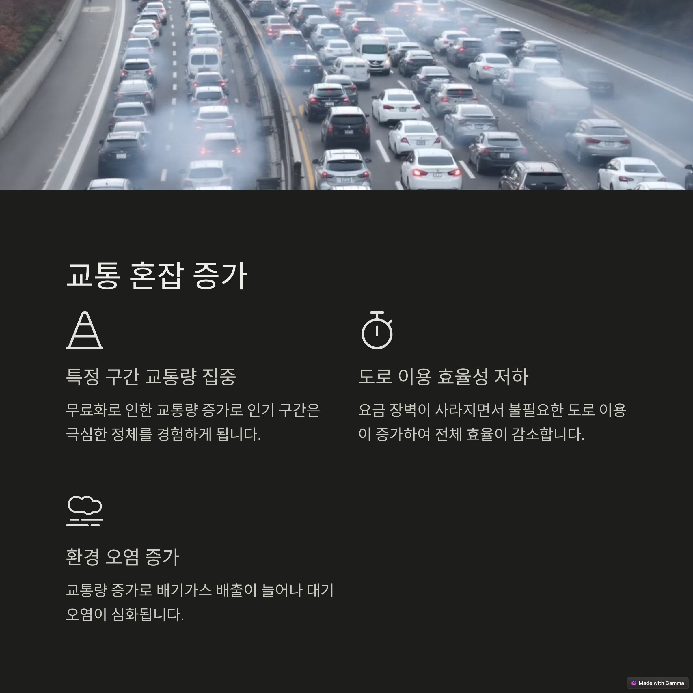| 통행료 없이 공공이 운영하는 도로 정책 | 수익 구조가 약화되어 재정 압박 발생 | 무료도로 쏠림현상으로 특정 구간 정체 증가 |