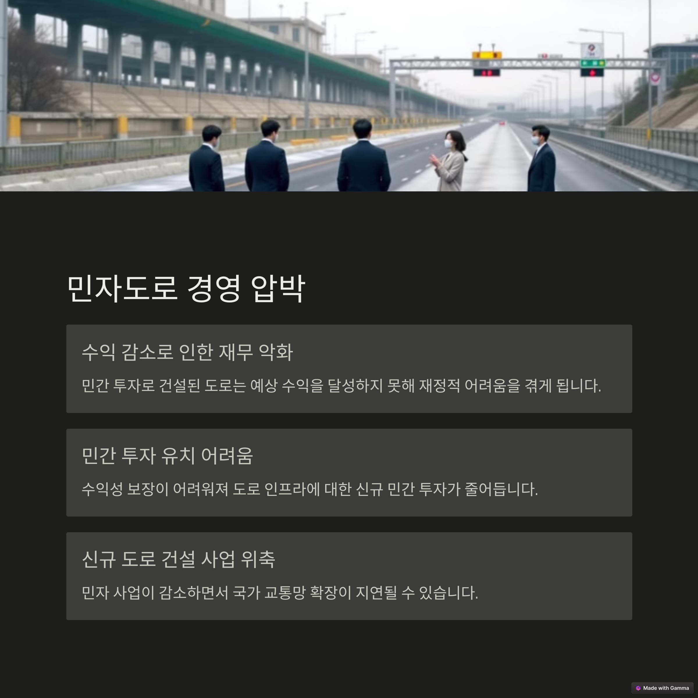 | 통행료 없이 공공이 운영하는 도로 정책 | 수익 구조가 약화되어 재정 압박 발생 | 무료도로 쏠림현상으로 특정 구간 정체 증가 |