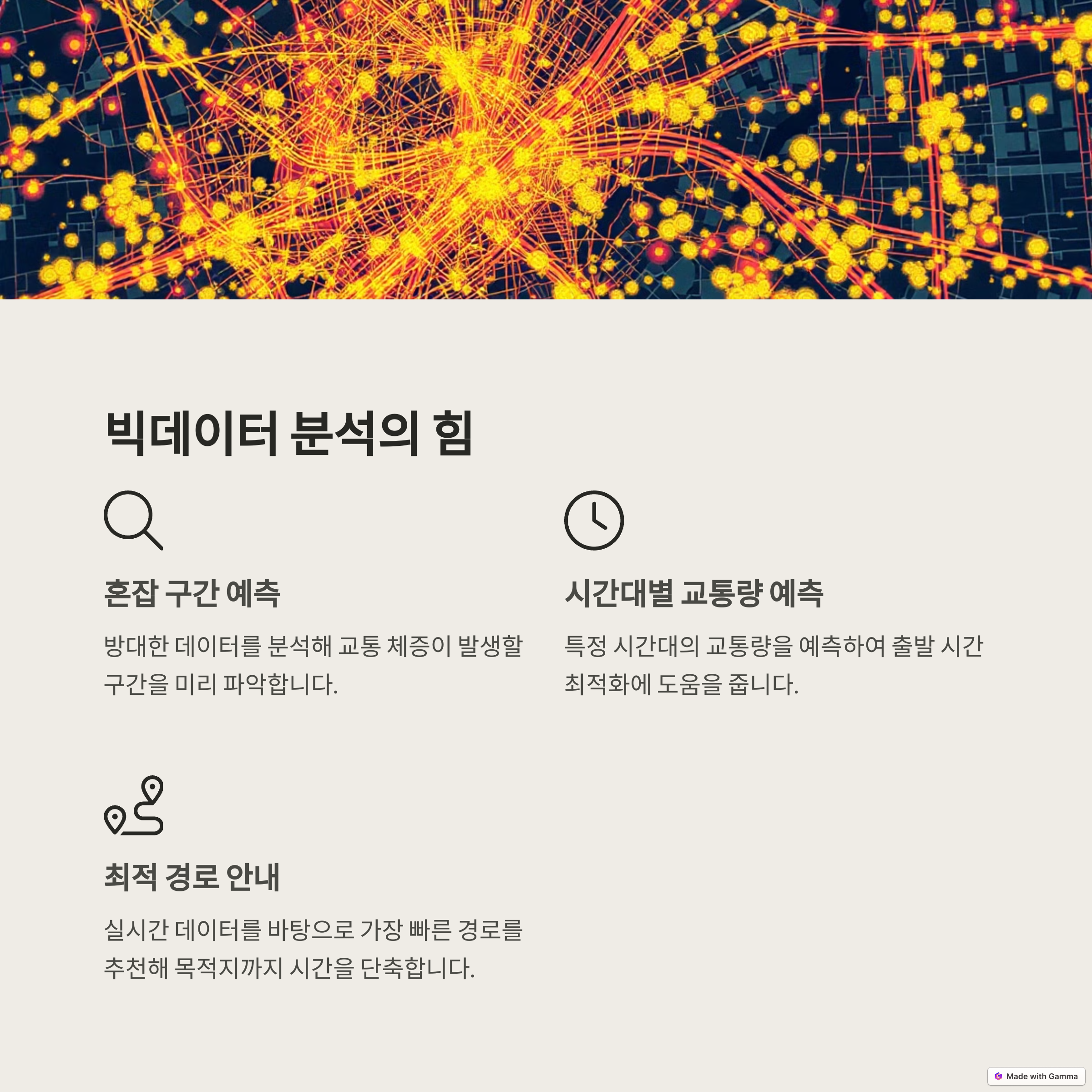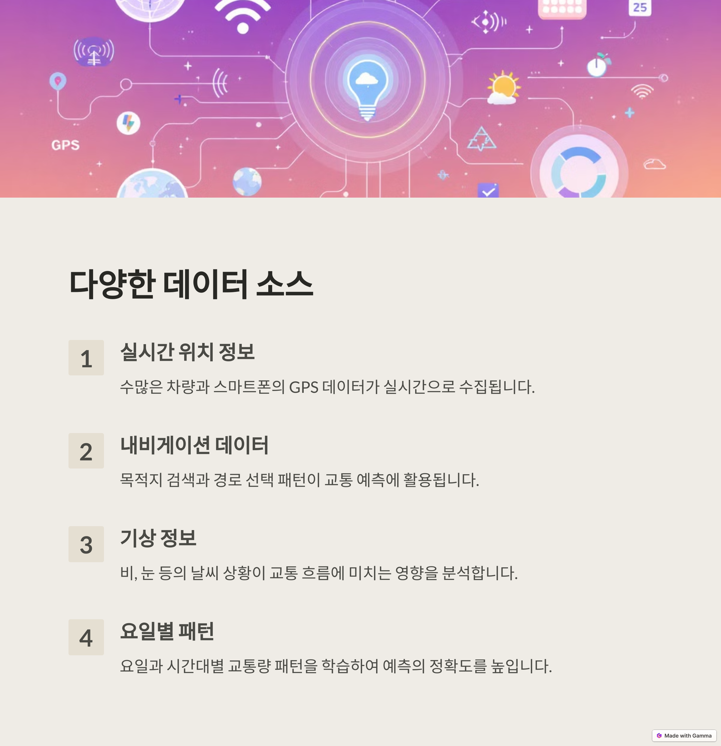 | 다양한 디바이스에서 수집되는 실시간 위치/이동 정보 | 시간/요일/날씨 기반 혼잡 구간 및 속도 추정 | 실시간으로 교통 흐름을 감지하고 신호 제어에 반영 |