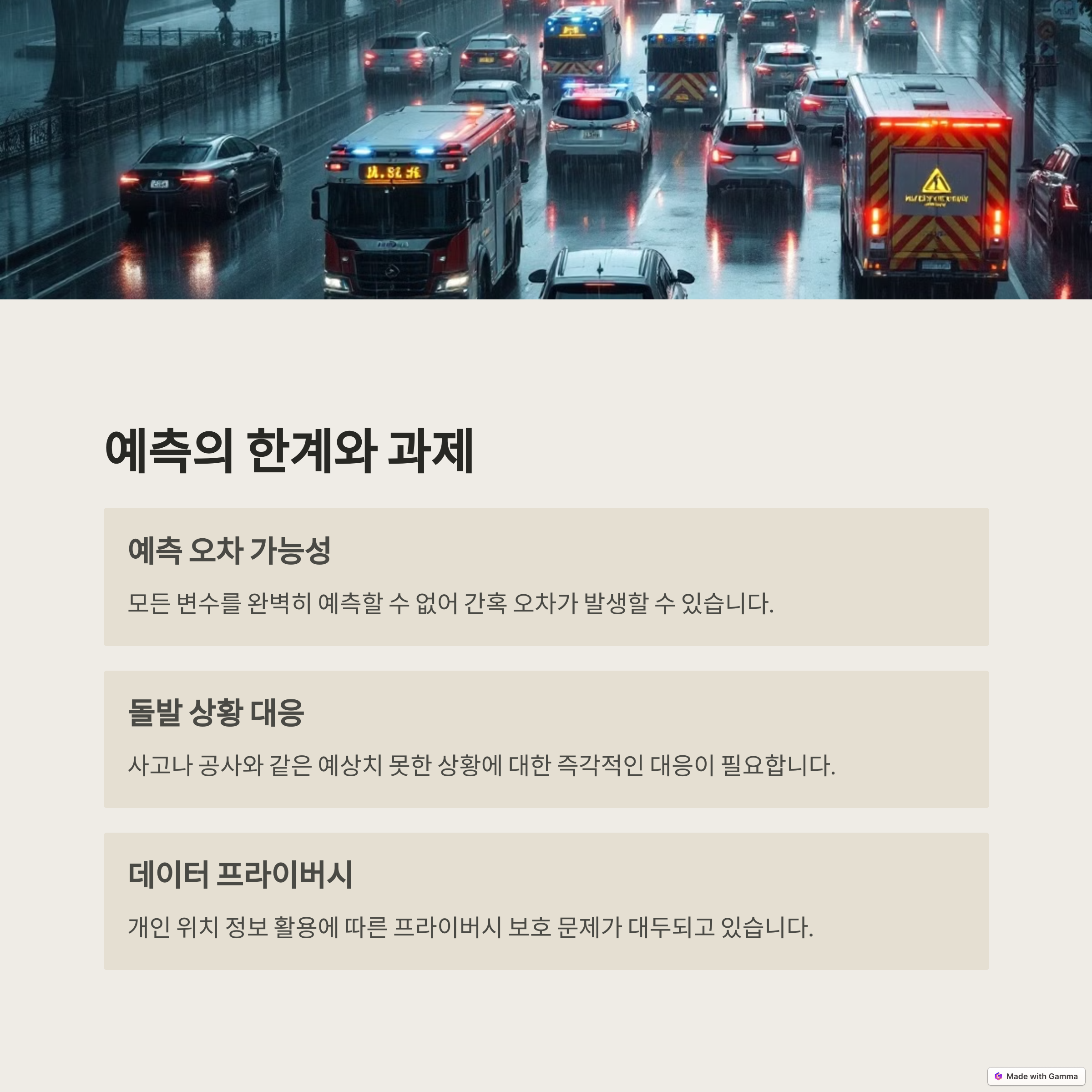 다만, 예측 모델의 정확도는 완벽하지 않다는 점도 유의해야 합니다. 갑작스러운 사고, 시위, 기상 악화 등은 어떤 빅데이터로도 미리 감지하기 어렵기 때문입니다. 따라서 빅데이터 기반 예측은 교통정책 보조수단, 신호 조정, 대중교통 연계에 효과적이지만, 항상 예외 상황을 고려한 유연한 대응 체계도 병행되어야 합니다.