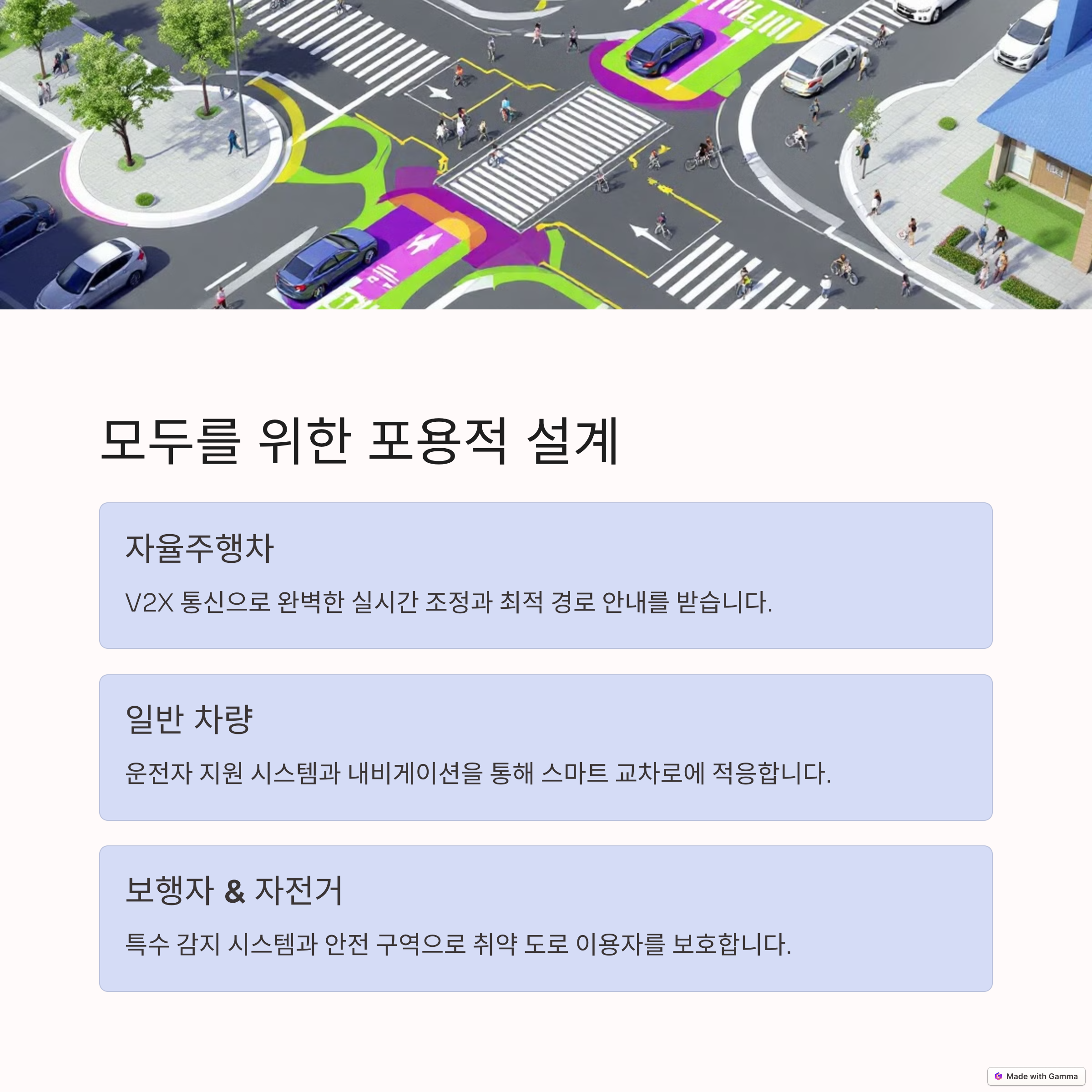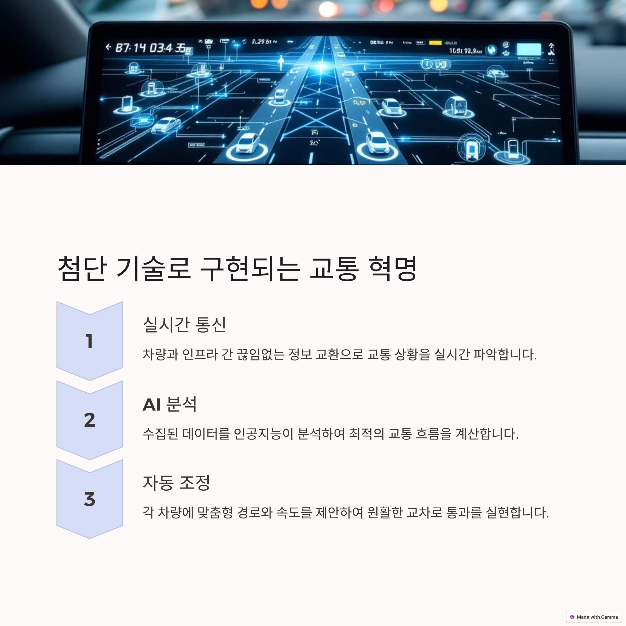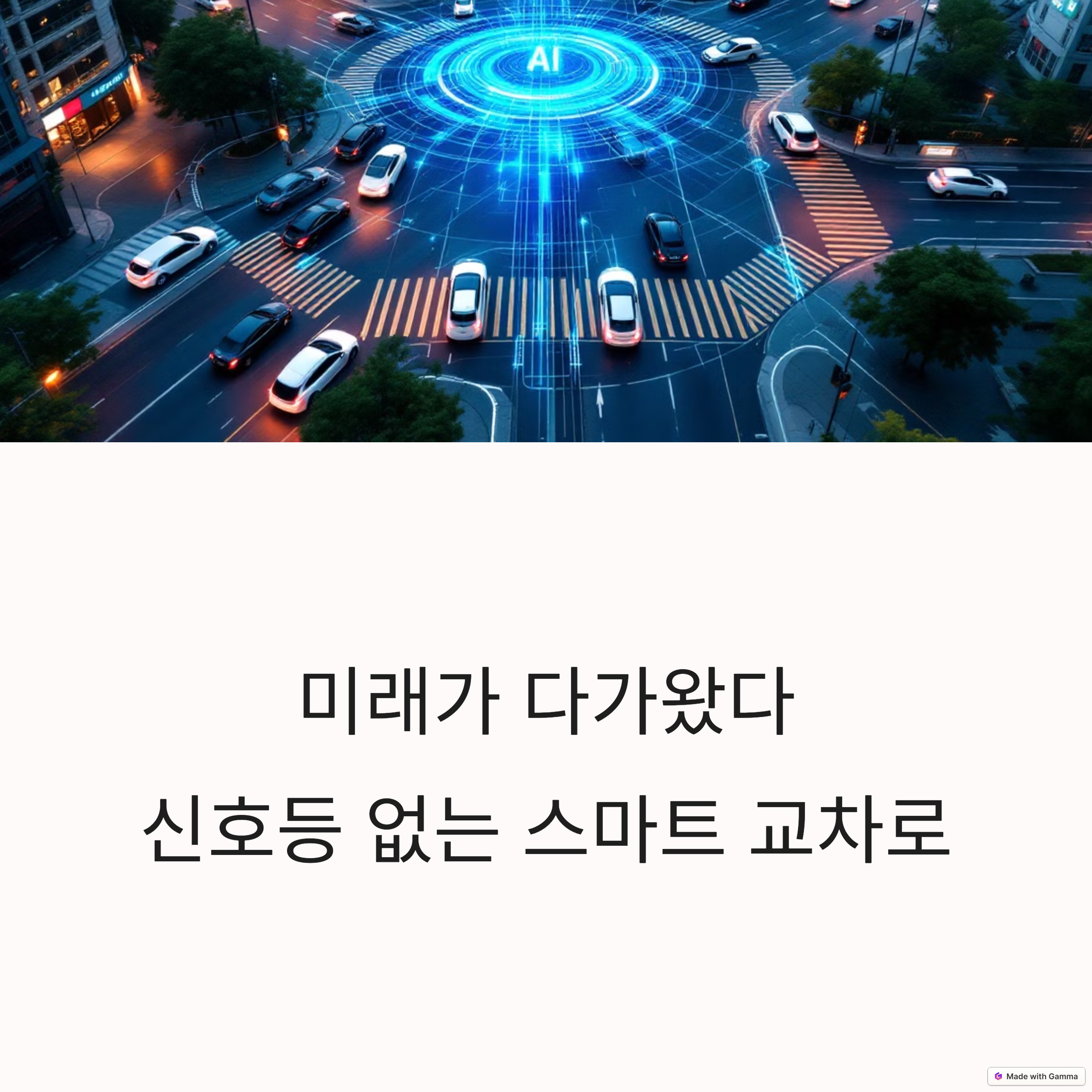 | AI와 통신 기반의 교차로 시스템 | 운전자 없이 스스로 주행하는 차량 기술 | 정지 신호 없이도 안전하게 교차 가능 |