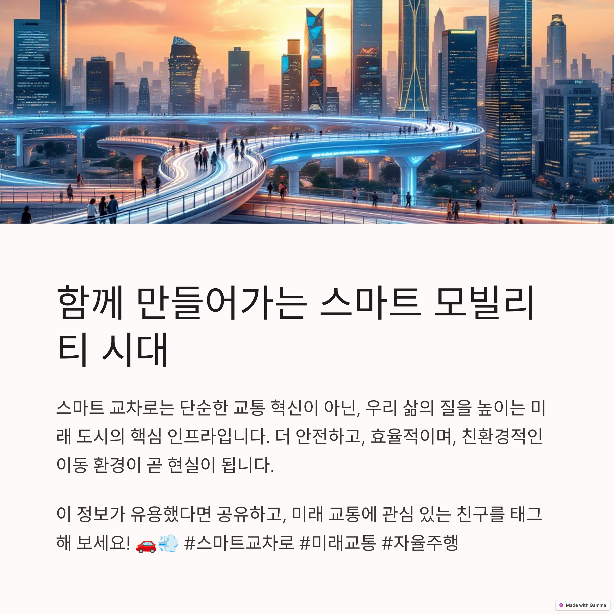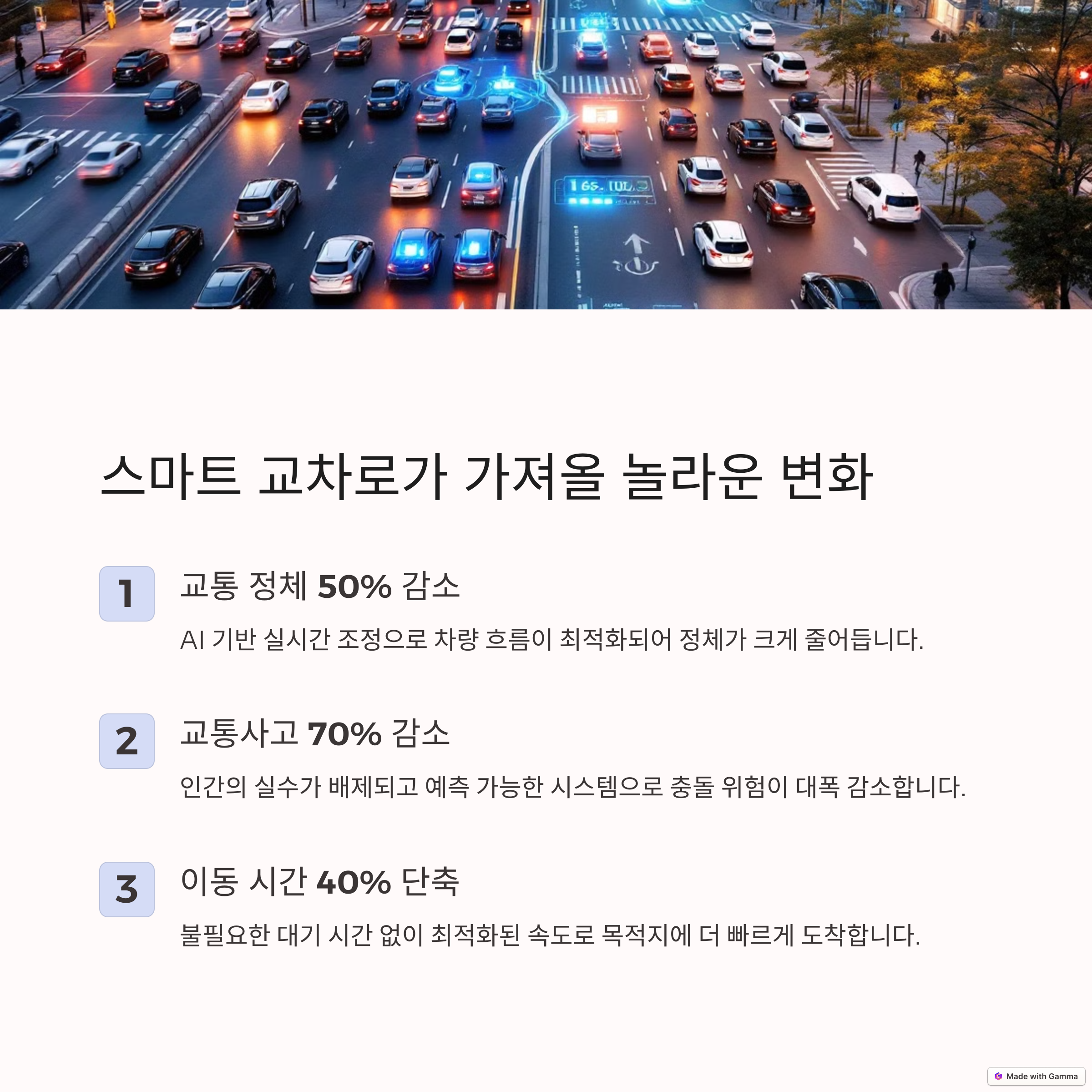 | 교통 체증 완화와 안전 향상 기대 | 스마트 시티의 핵심 인프라 요소 | 미래 도시 계획에서 중요한 역할 |