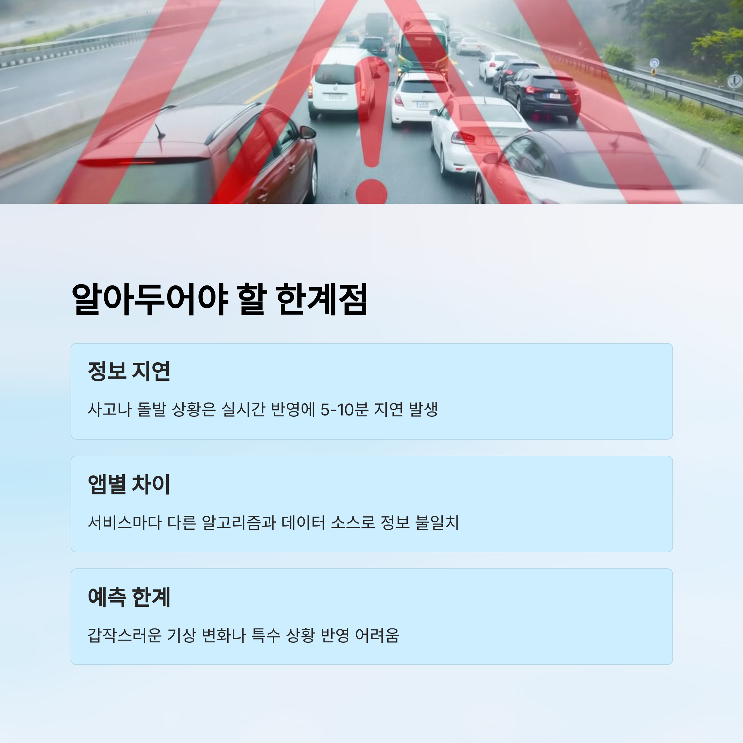 하지만 모든 실시간 정보가 100% 정확하진 않습니다. 교통사고처럼 돌발 상황은 수집 시스템의 한계로 인해 수 분 이상 늦게 반영되기도 하고, 일부 구간은 센서가 부족해 정확한 분석이 어려운 경우도 많습니다. 또한 앱별 정보처리 방식의 차이로 같은 위치에서도 다른 혼잡도로 표시되는 경우가 생길 수 있습니다. 그렇기에 실시간 정보도 일정 수준의 해석과 판단이 필요합니다.