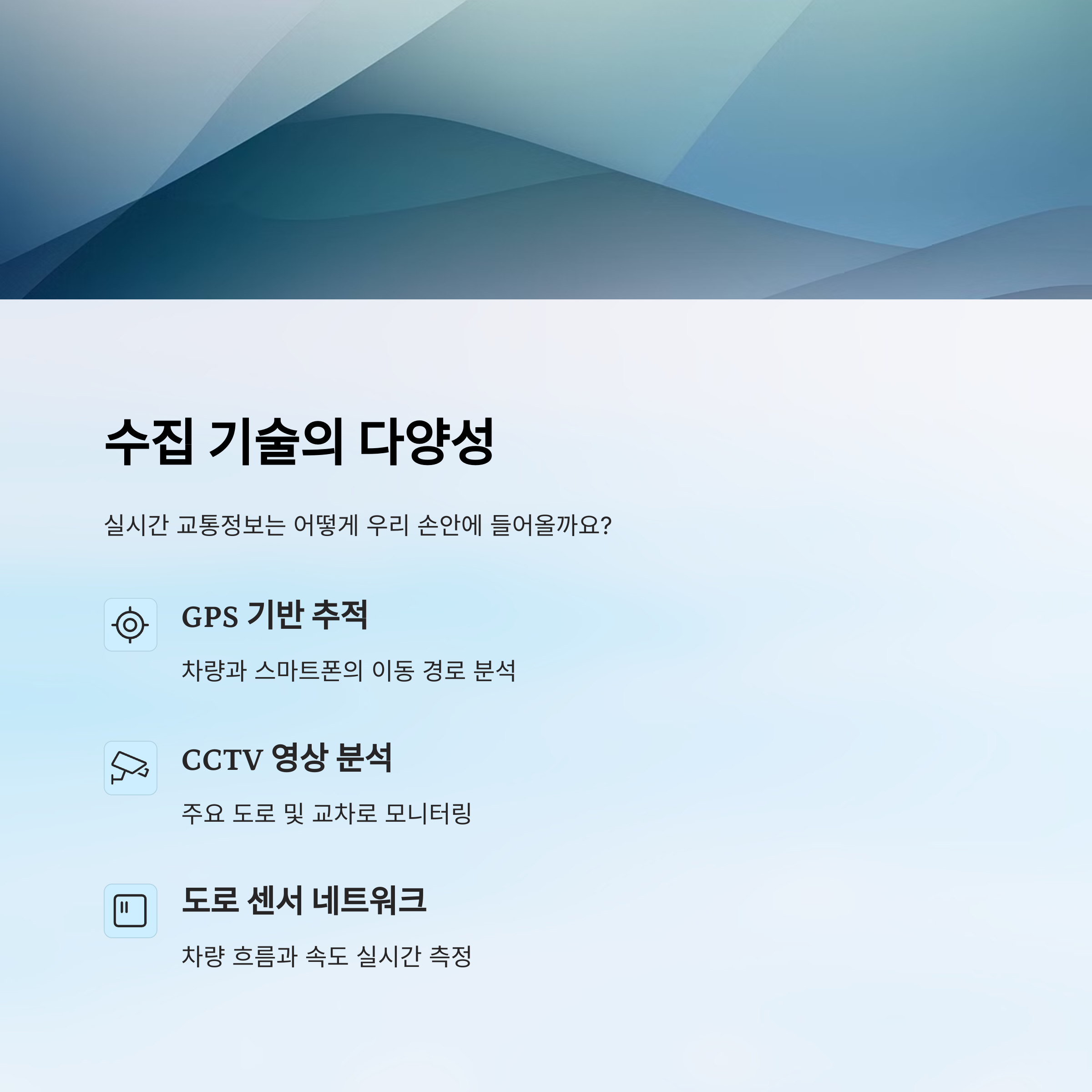 | 실시간 교통정보 | 현재 도로의 정체, 속도, 사고 여부를 빠르게 전달하는 정보 시스템입니다. |