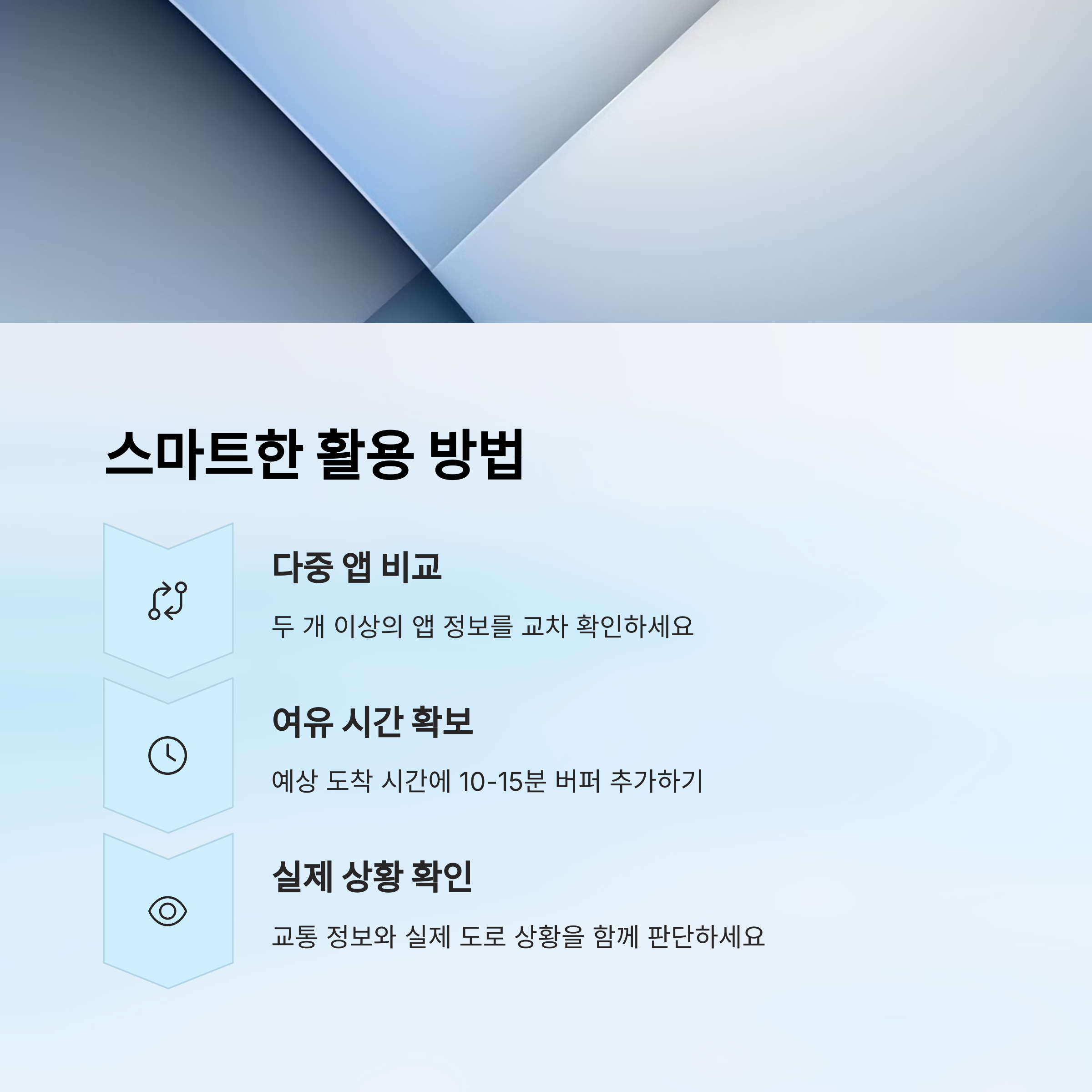 하지만 모든 실시간 정보가 100% 정확하진 않습니다. 교통사고처럼 돌발 상황은 수집 시스템의 한계로 인해 수 분 이상 늦게 반영되기도 하고, 일부 구간은 센서가 부족해 정확한 분석이 어려운 경우도 많습니다. 또한 앱별 정보처리 방식의 차이로 같은 위치에서도 다른 혼잡도로 표시되는 경우가 생길 수 있습니다. 그렇기에 실시간 정보도 일정 수준의 해석과 판단이 필요합니다.