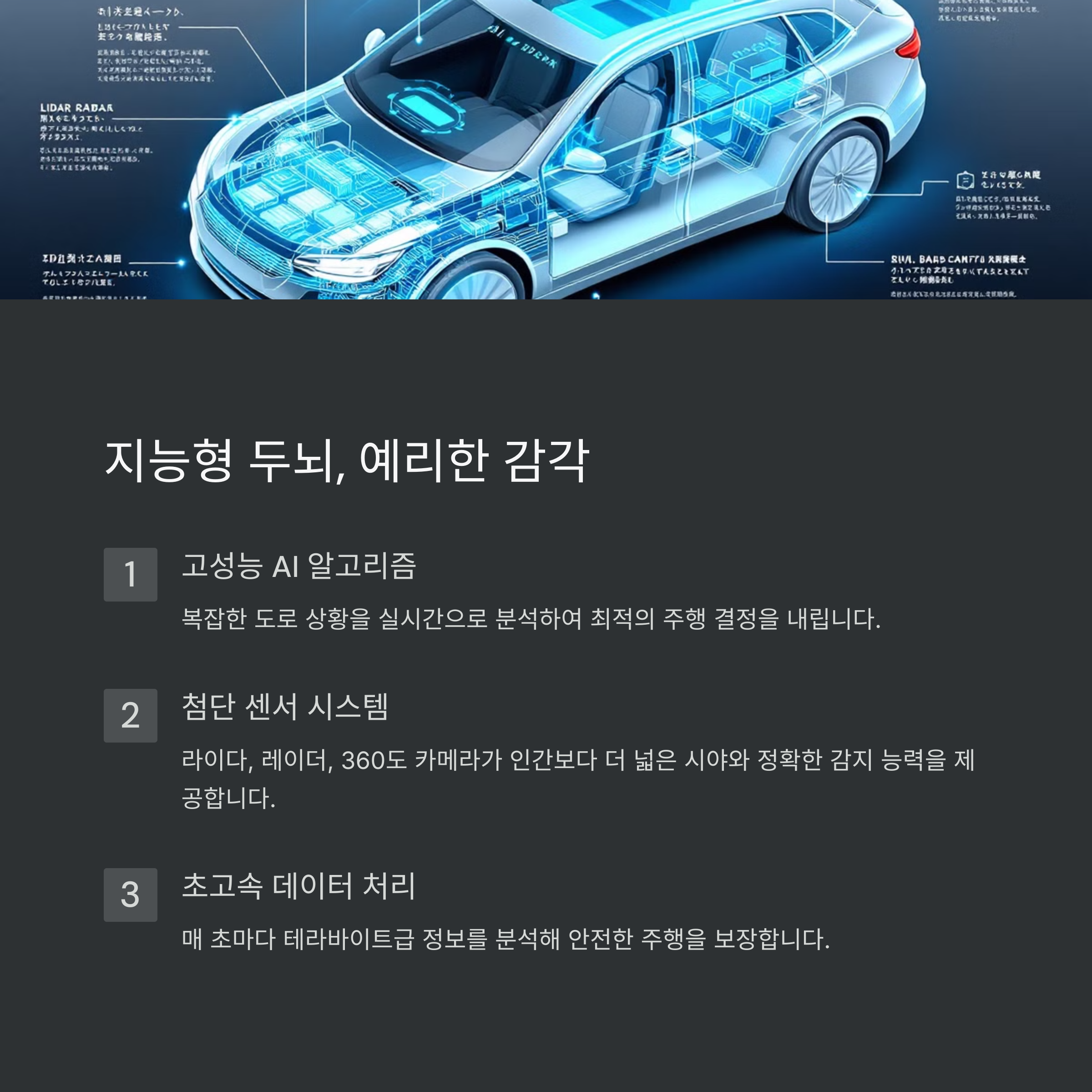 | 자율주행차 | 인공지능과 센서를 통해 스스로 운행하는 차량입니다. |