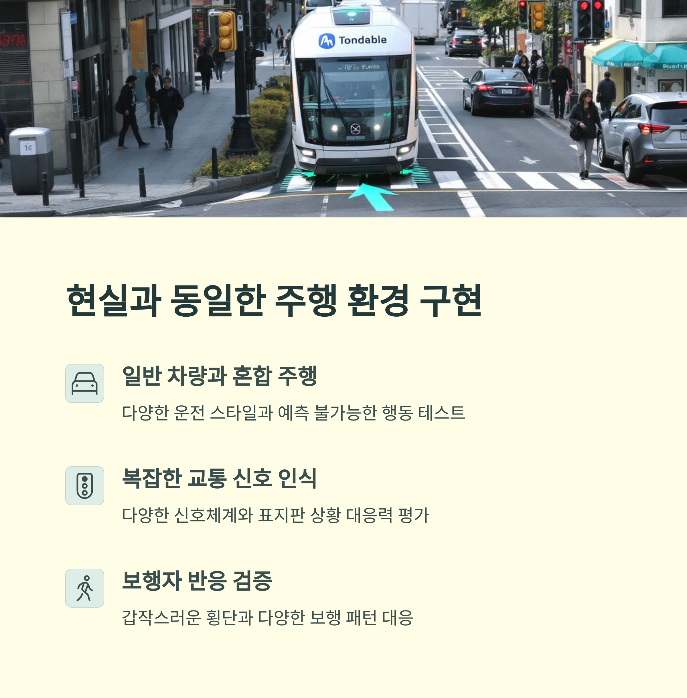 | 상용화 전 최종 검증 단계 | 기술 신뢰도 확보 및 오류 수정 | 실제 사람과의 혼합 주행 시나리오 구현 |