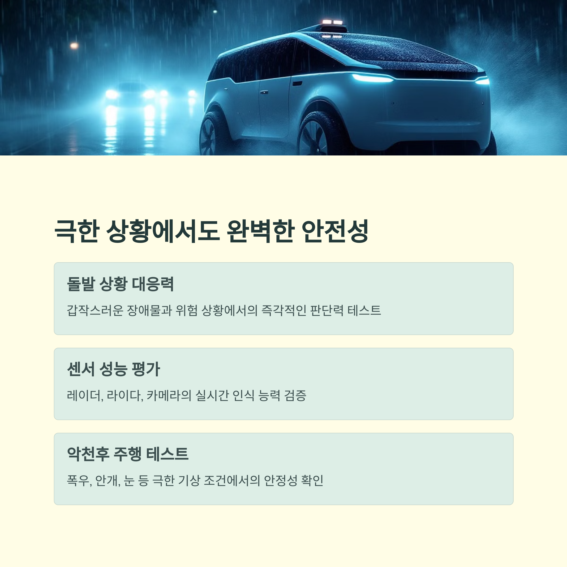 | 상용화 전 최종 검증 단계 | 기술 신뢰도 확보 및 오류 수정 | 실제 사람과의 혼합 주행 시나리오 구현 |