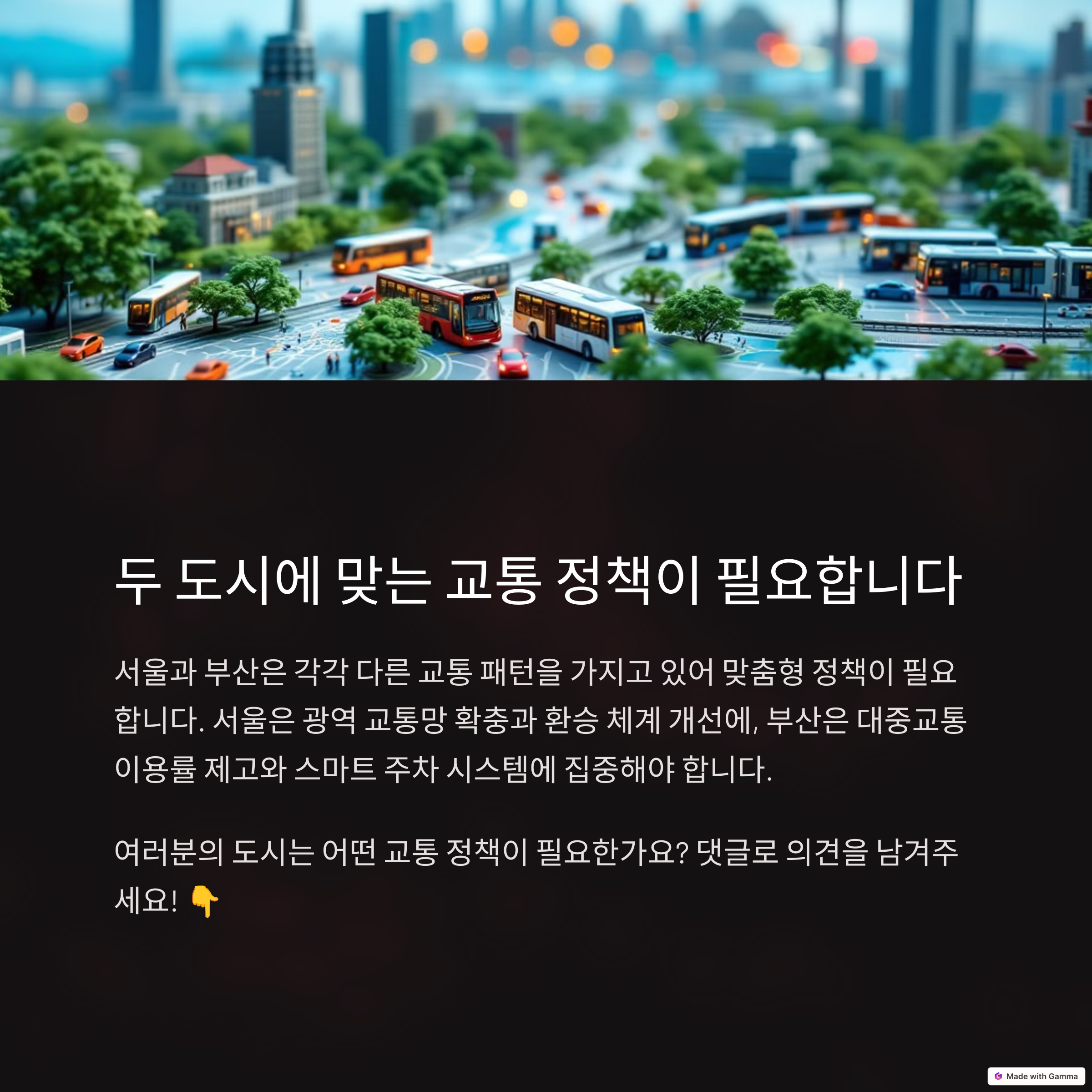 여러분은 서울과 부산 중 어디의 교통 환경이 더 편리하다고 느끼시나요? 출퇴근길에서 느끼는 장단점, 개선되었으면 하는 점 등 자유롭게 의견을 남겨주세요! 다양한 경험이 공유될수록 더 좋은 교통 정책에 기여할 수 있습니다.