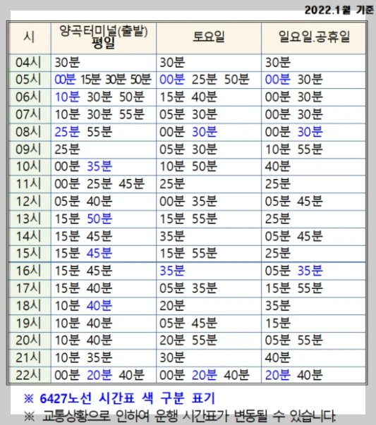 M6427번 김포시 급행버스 기점 출발 종점 시간표